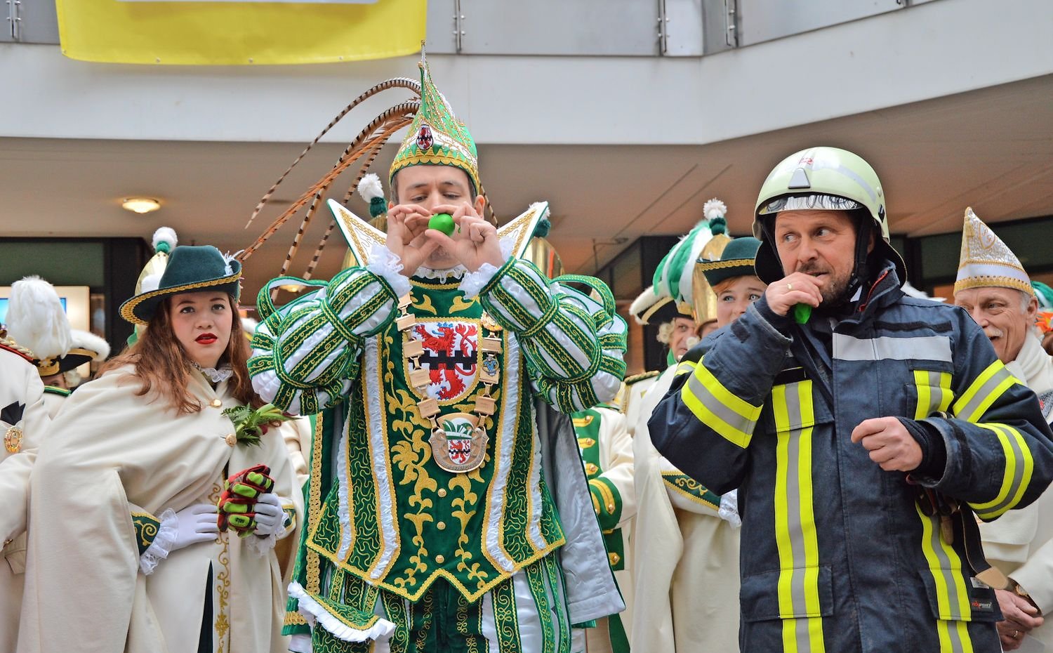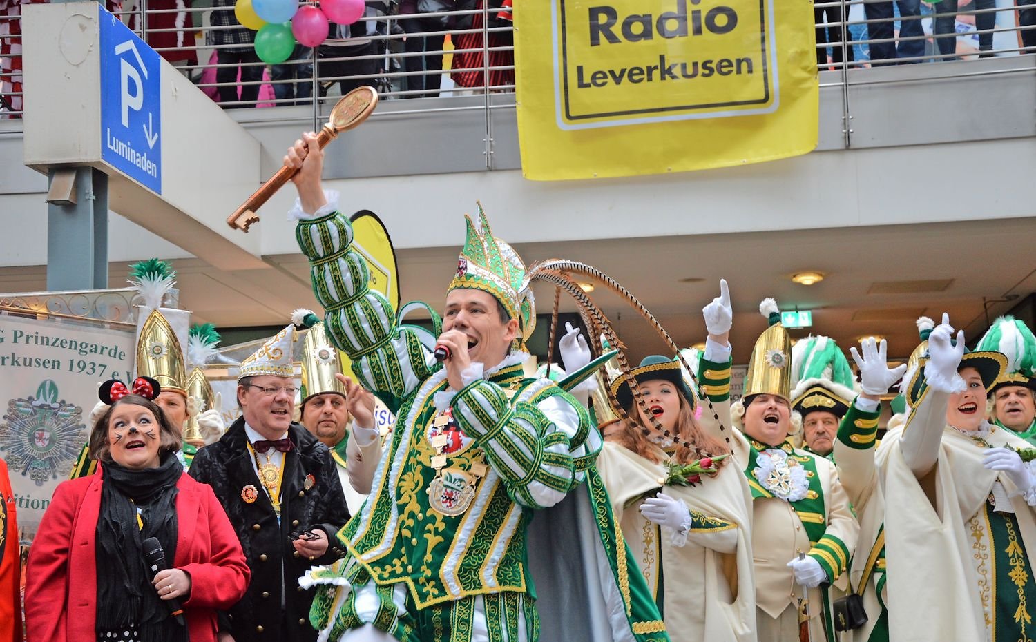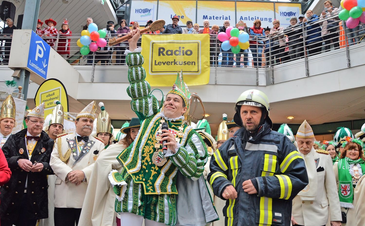 Zum Rathaussturm in Leverkusen treffen sich die Karnevalisten in den Luminaden, einem Einkaufcenter in Wiesdorf. Angeführt vom Bayer-Spielmannszug und Abordnungen Leverkusener Karnevalsgesellschaften wurde Prinz Kerbi. I. von beiden Prinzengarden in die „Manege“ geführt. Mit Oberbürgermeister Uwe Richrath gab es dann eine paar Spielchen rund um Feuerwehr Accessoires.